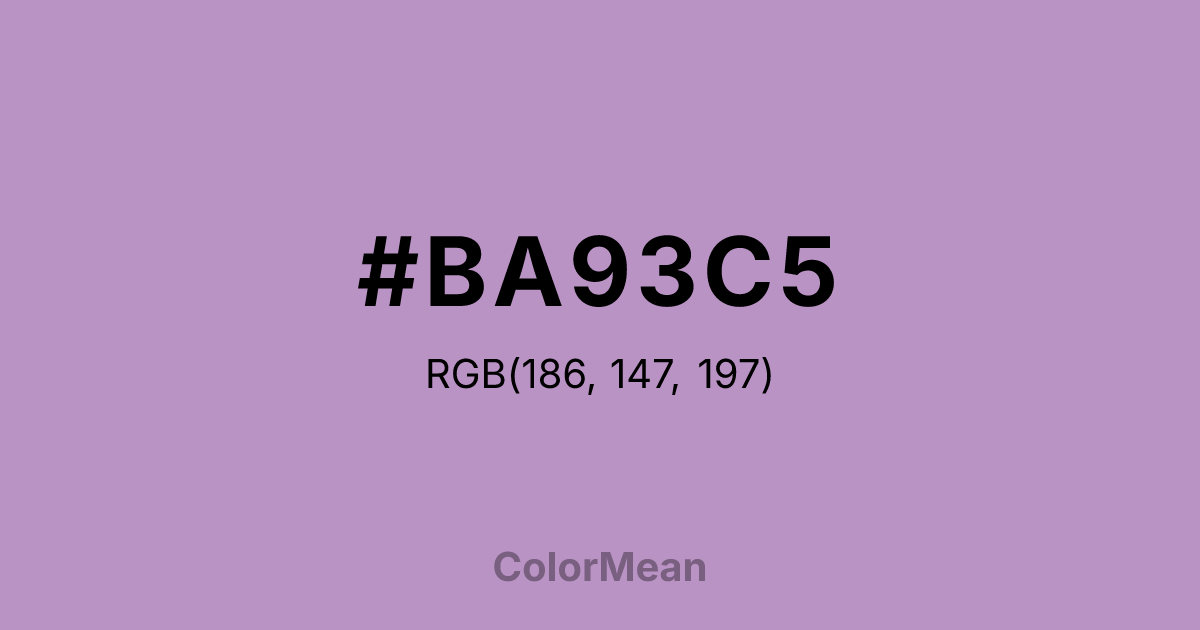 #BA93C5 RGB value is (186, 147, 197). The hex color red value is 186, green is 147, and blue is 197. Its HSL format shows a hue of 287°, saturation of 30 percent, and lightness of 67 percent. The CMYK process values are 6 percent, 25 percent, 0 percent, 23 percent.