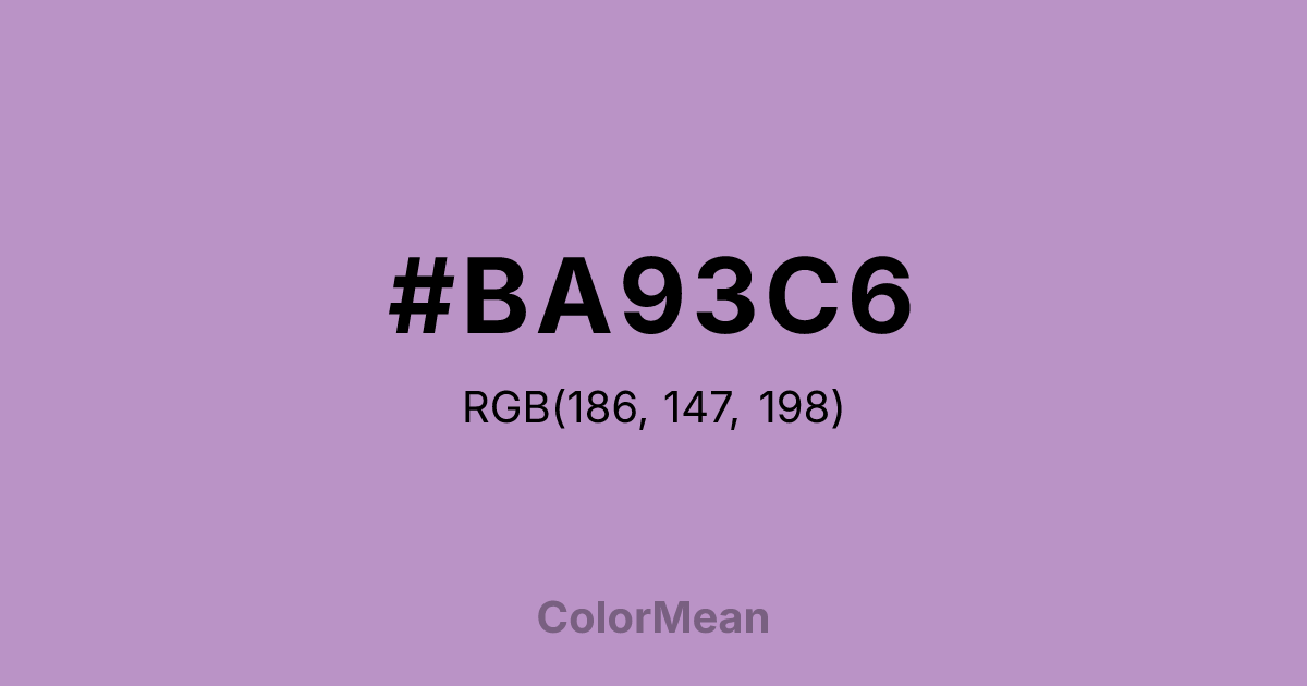 #BA93C6 RGB value is (186, 147, 198). The hex color red value is 186, green is 147, and blue is 198. Its HSL format shows a hue of 286°, saturation of 31 percent, and lightness of 68 percent. The CMYK process values are 6 percent, 26 percent, 0 percent, 22 percent.