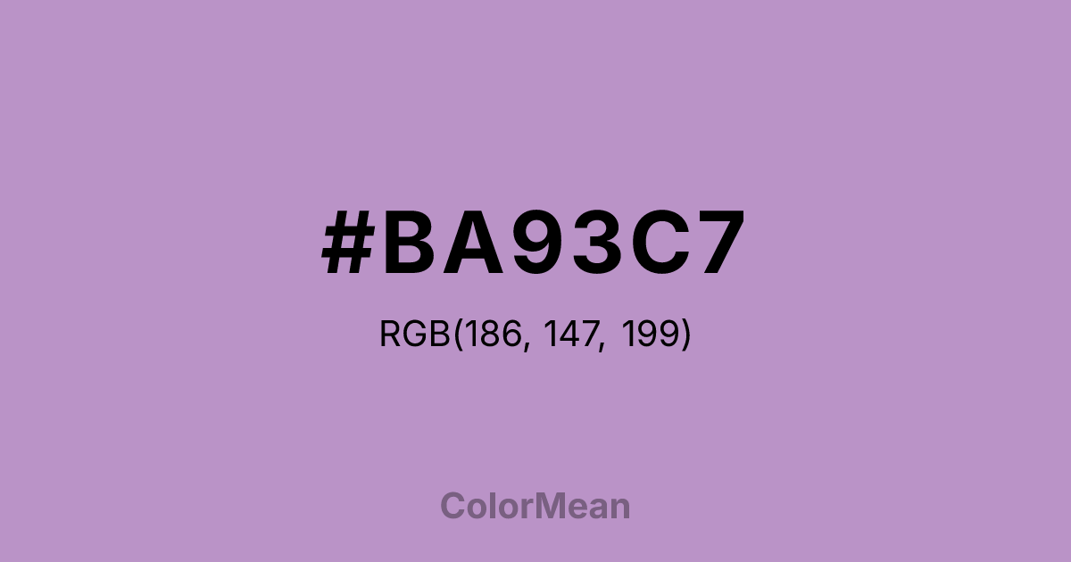 #BA93C7 RGB value is (186, 147, 199). The hex color red value is 186, green is 147, and blue is 199. Its HSL format shows a hue of 285°, saturation of 32 percent, and lightness of 68 percent. The CMYK process values are 7 percent, 26 percent, 0 percent, 22 percent.