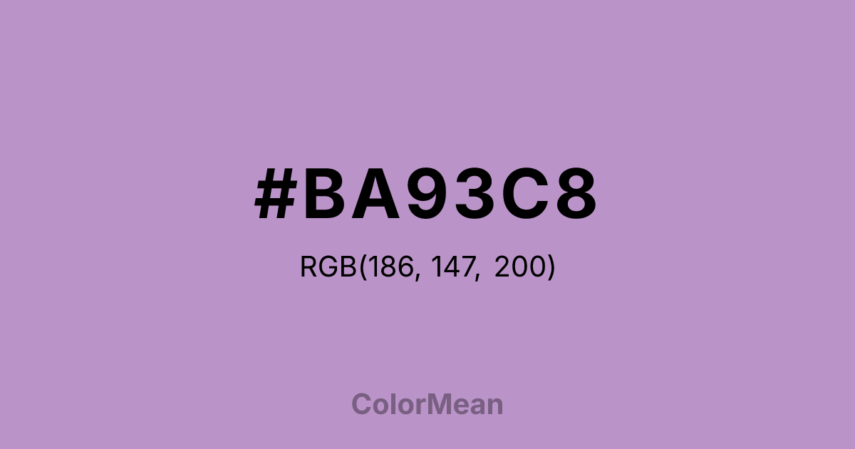 #BA93C8 RGB value is (186, 147, 200). The hex color red value is 186, green is 147, and blue is 200. Its HSL format shows a hue of 284°, saturation of 33 percent, and lightness of 68 percent. The CMYK process values are 7 percent, 27 percent, 0 percent, 22 percent.