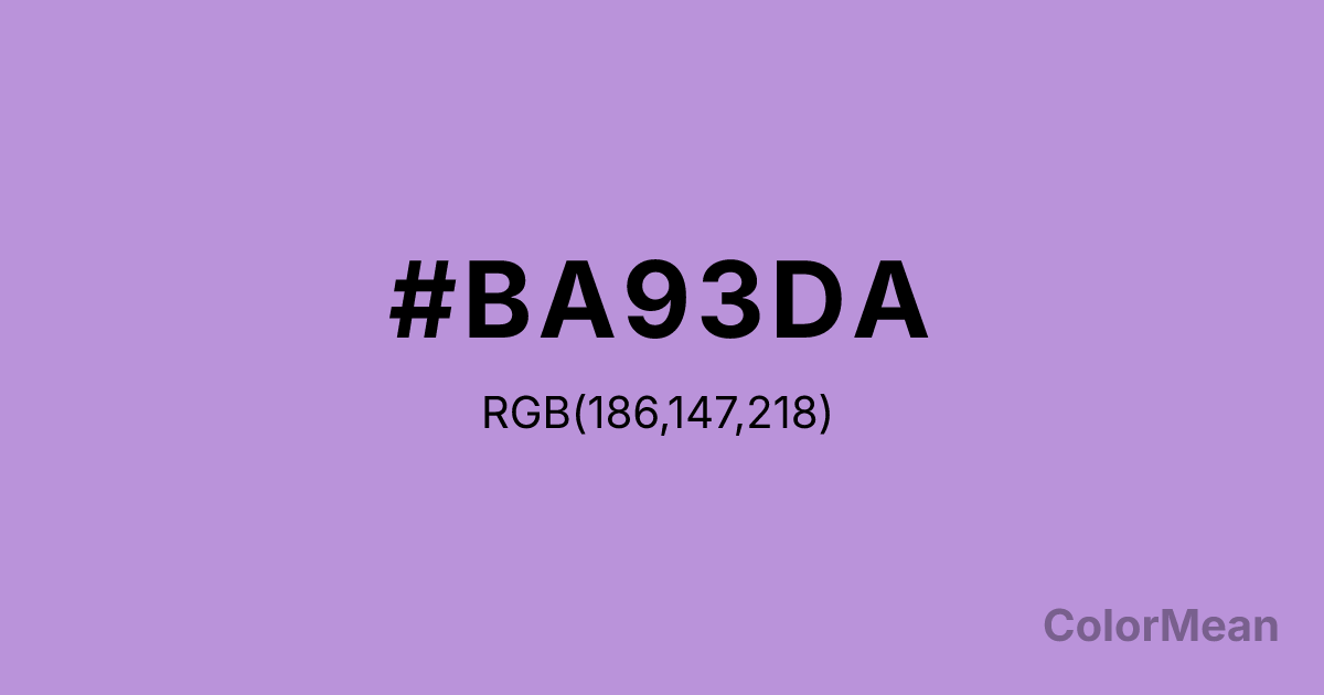 #BA93DA RGB value is (186, 147, 218). The hex color red value is 186, green is 147, and blue is 218. Its HSL format shows a hue of 273°, saturation of 49 percent, and lightness of 72 percent. The CMYK process values are 15 percent, 33 percent, 0 percent, 15 percent.