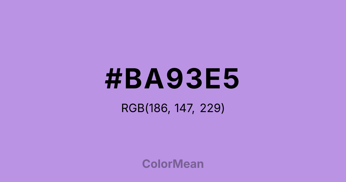 #BA93E5 RGB value is (186, 147, 229). The hex color red value is 186, green is 147, and blue is 229. Its HSL format shows a hue of 269°, saturation of 61 percent, and lightness of 74 percent. The CMYK process values are 19 percent, 36 percent, 0 percent, 10 percent.