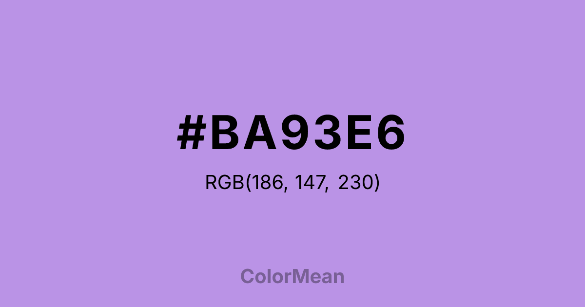 #BA93E6 RGB value is (186, 147, 230). The hex color red value is 186, green is 147, and blue is 230. Its HSL format shows a hue of 268°, saturation of 62 percent, and lightness of 74 percent. The CMYK process values are 19 percent, 36 percent, 0 percent, 10 percent.