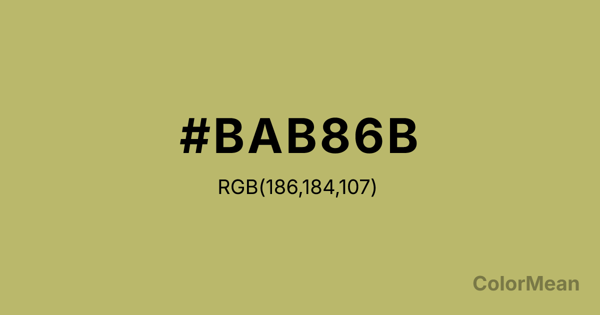 #BAB86B RGB value is (186, 184, 107). The hex color red value is 186, green is 184, and blue is 107. Its HSL format shows a hue of 58°, saturation of 36 percent, and lightness of 57 percent. The CMYK process values are 0 percent, 1 percent, 42 percent, 27 percent.