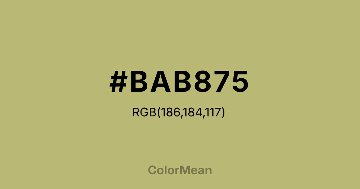 #BAB875 RGB value is (186, 184, 117). The hex color red value is 186, green is 184, and blue is 117. Its HSL format shows a hue of 58°, saturation of 33 percent, and lightness of 59 percent. The CMYK process values are 0 percent, 1 percent, 37 percent, 27 percent.