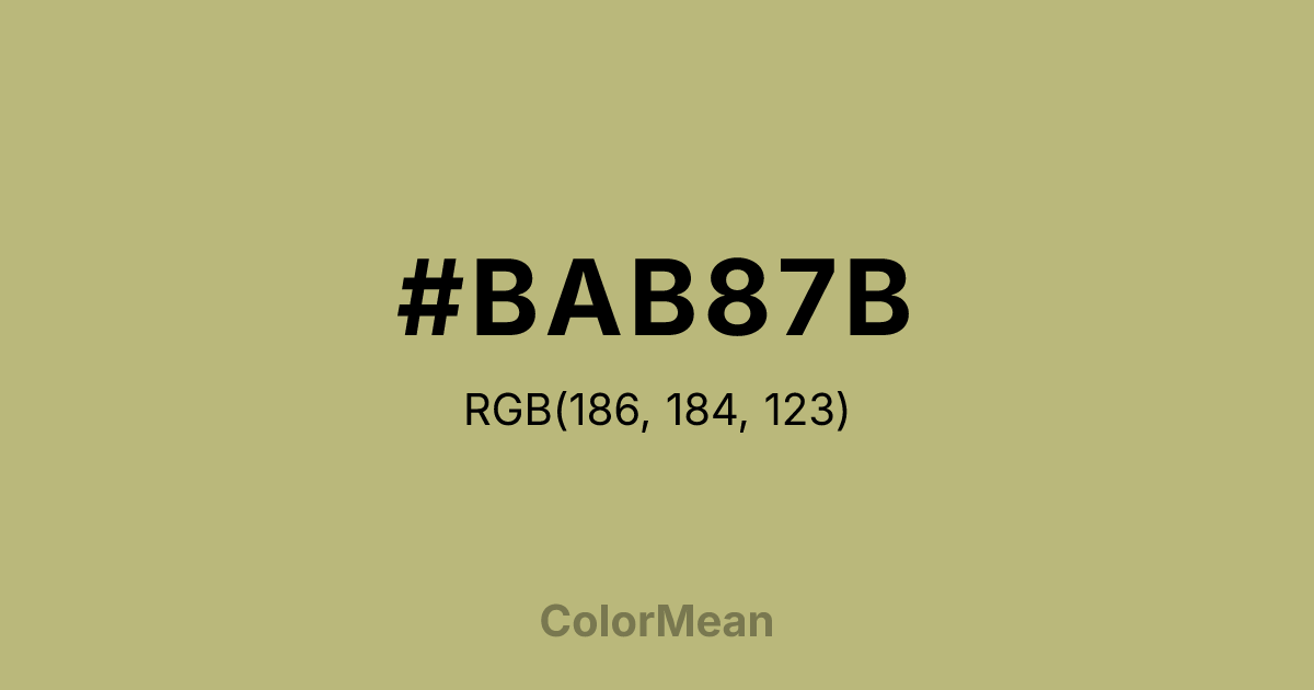 #BAB87B RGB value is (186, 184, 123). The hex color red value is 186, green is 184, and blue is 123. Its HSL format shows a hue of 58°, saturation of 31 percent, and lightness of 61 percent. The CMYK process values are 0 percent, 1 percent, 34 percent, 27 percent.