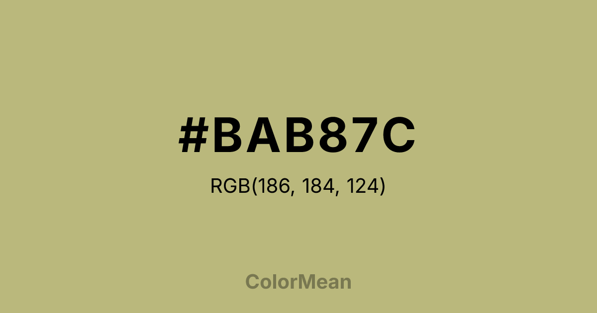 #BAB87C RGB value is (186, 184, 124). The hex color red value is 186, green is 184, and blue is 124. Its HSL format shows a hue of 58°, saturation of 31 percent, and lightness of 61 percent. The CMYK process values are 0 percent, 1 percent, 33 percent, 27 percent.