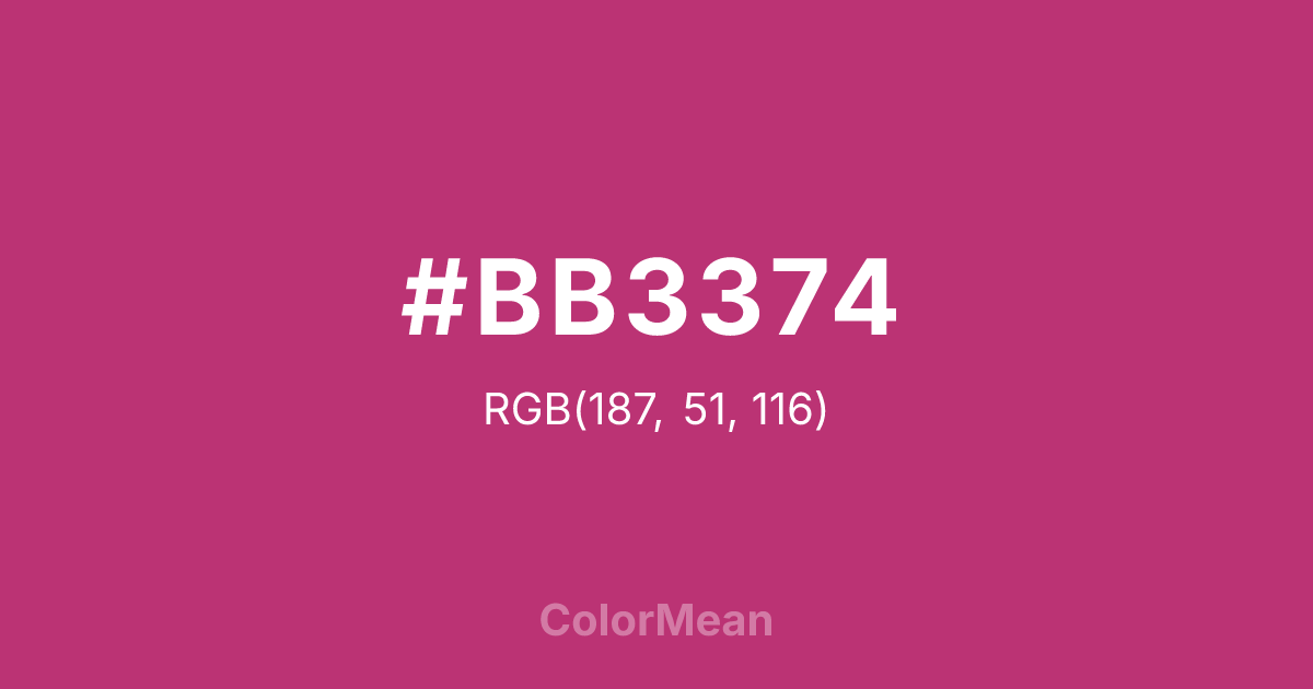 #BB3374 RGB value is (187, 51, 116). The hex color red value is 187, green is 51, and blue is 116. Its HSL format shows a hue of 331°, saturation of 57 percent, and lightness of 47 percent. The CMYK process values are 0 percent, 73 percent, 38 percent, 27 percent.