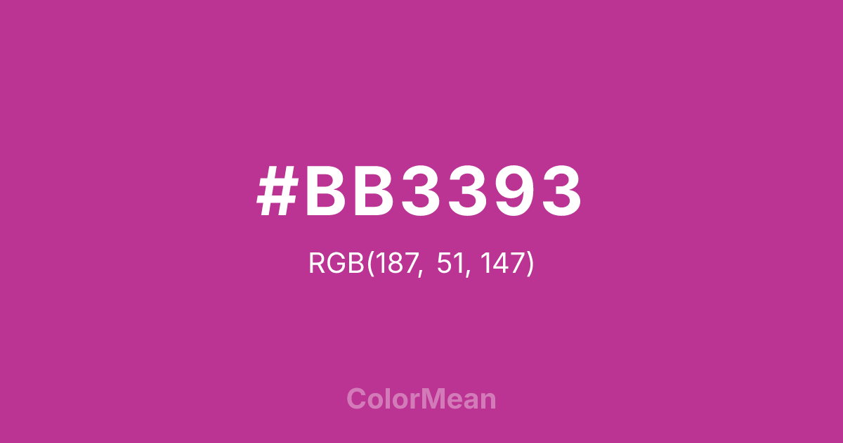 #BB3393 RGB value is (187, 51, 147). The hex color red value is 187, green is 51, and blue is 147. Its HSL format shows a hue of 318°, saturation of 57 percent, and lightness of 47 percent. The CMYK process values are 0 percent, 73 percent, 21 percent, 27 percent.