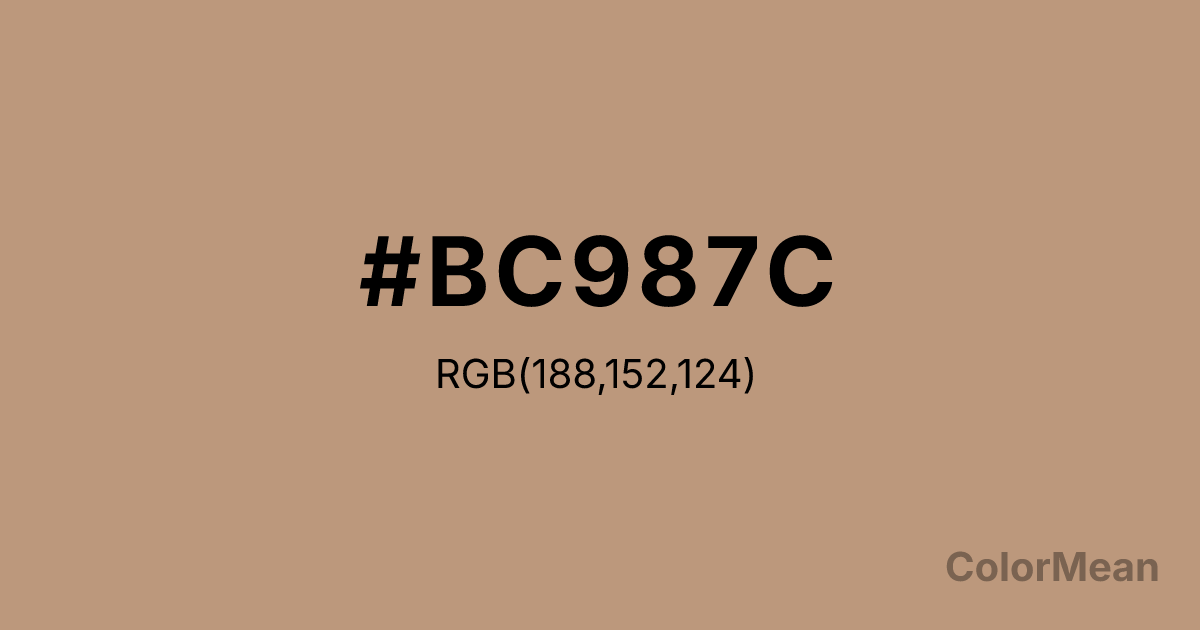 #BC987C RGB value is (188, 152, 124). The hex color red value is 188, green is 152, and blue is 124. Its HSL format shows a hue of 26°, saturation of 32 percent, and lightness of 61 percent. The CMYK process values are 0 percent, 19 percent, 34 percent, 26 percent.