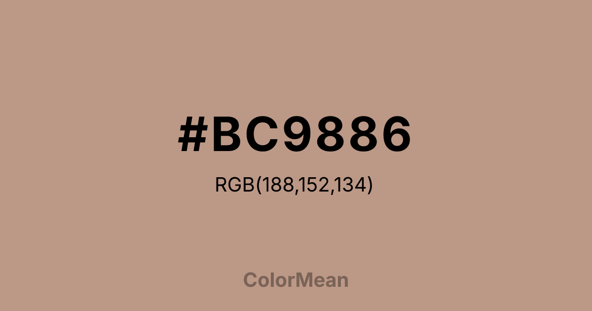 #BC9886 RGB value is (188, 152, 134). The hex color red value is 188, green is 152, and blue is 134. Its HSL format shows a hue of 20°, saturation of 29 percent, and lightness of 63 percent. The CMYK process values are 0 percent, 19 percent, 29 percent, 26 percent.
