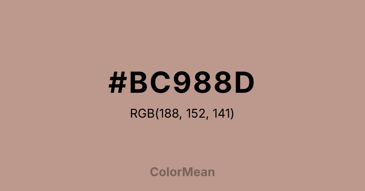 #BC988D RGB value is (188, 152, 141). The hex color red value is 188, green is 152, and blue is 141. Its HSL format shows a hue of 14°, saturation of 26 percent, and lightness of 65 percent. The CMYK process values are 0 percent, 19 percent, 25 percent, 26 percent.