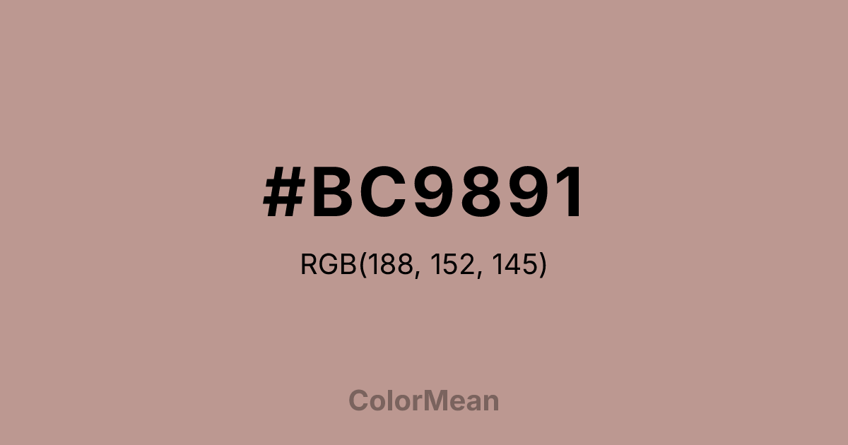 #BC9891 RGB value is (188, 152, 145). The hex color red value is 188, green is 152, and blue is 145. Its HSL format shows a hue of 10°, saturation of 24 percent, and lightness of 65 percent. The CMYK process values are 0 percent, 19 percent, 23 percent, 26 percent.