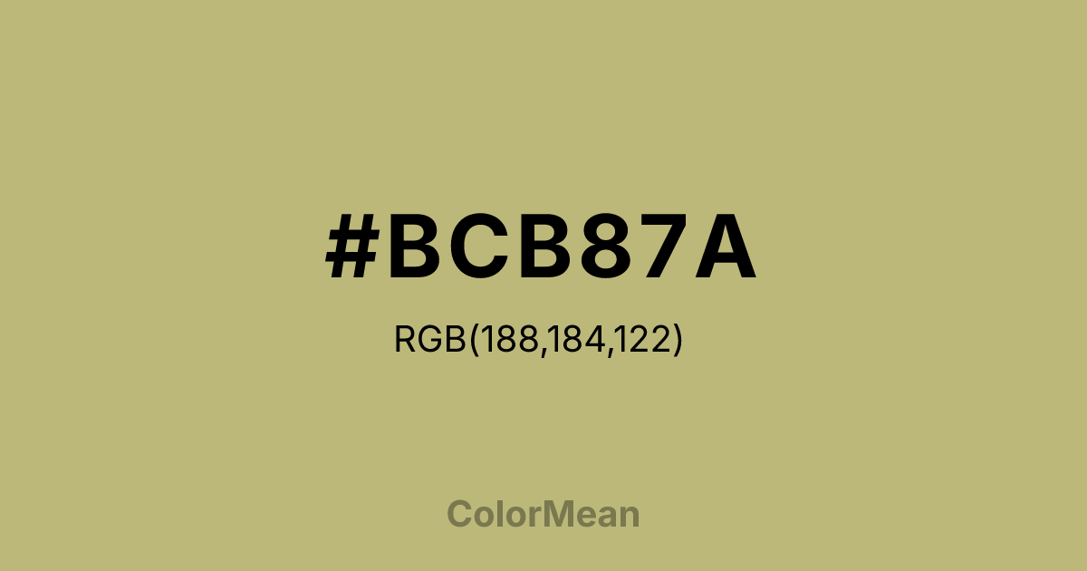 #BCB87A RGB value is (188, 184, 122). The hex color red value is 188, green is 184, and blue is 122. Its HSL format shows a hue of 56°, saturation of 33 percent, and lightness of 61 percent. The CMYK process values are 0 percent, 2 percent, 35 percent, 26 percent.