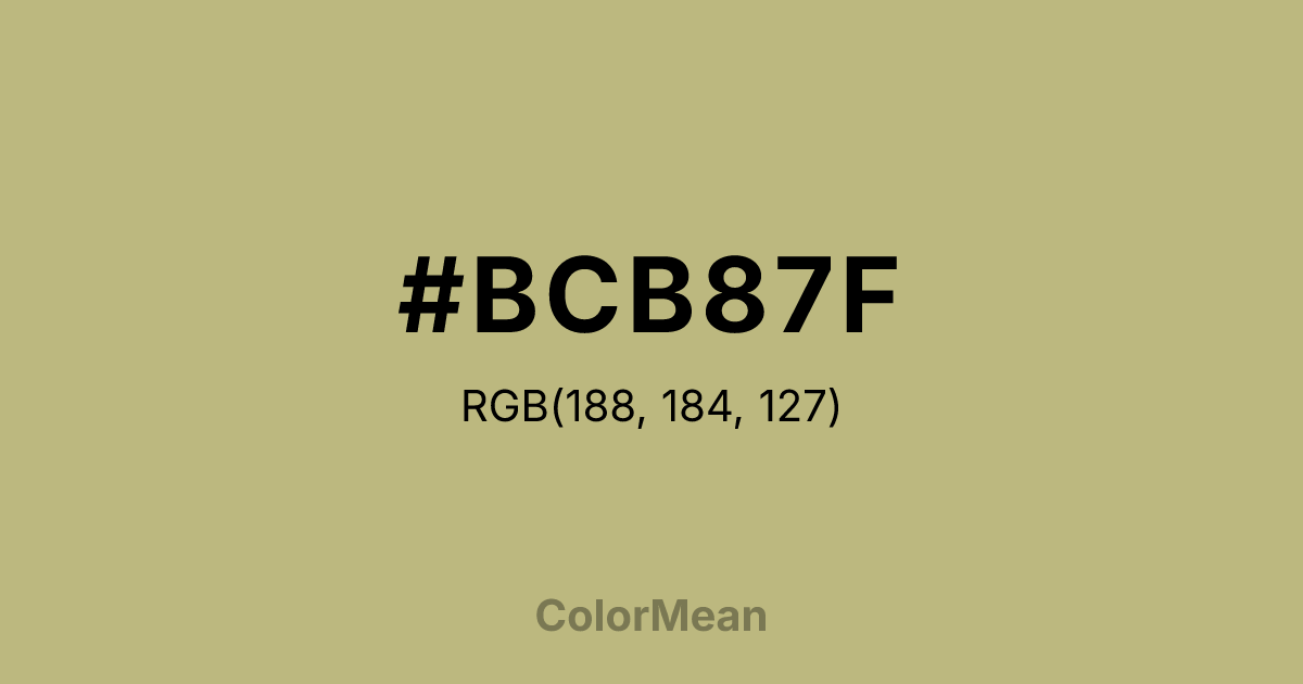 #BCB87F RGB value is (188, 184, 127). The hex color red value is 188, green is 184, and blue is 127. Its HSL format shows a hue of 56°, saturation of 31 percent, and lightness of 62 percent. The CMYK process values are 0 percent, 2 percent, 32 percent, 26 percent.