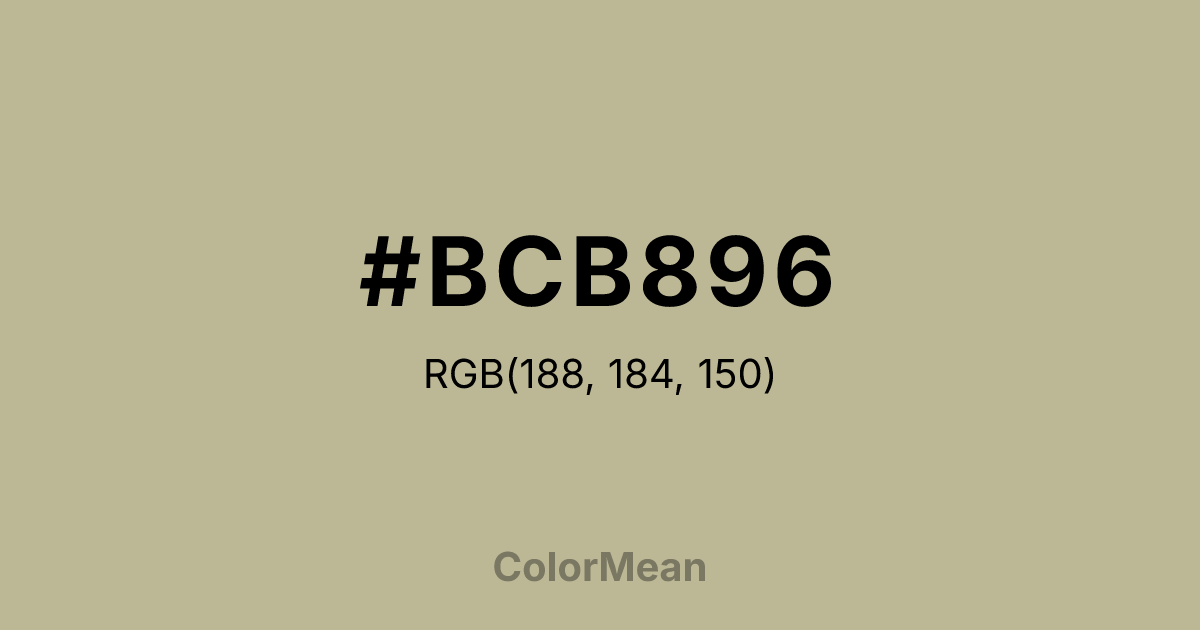 #BCB896 RGB value is (188, 184, 150). The hex color red value is 188, green is 184, and blue is 150. Its HSL format shows a hue of 54°, saturation of 22 percent, and lightness of 66 percent. The CMYK process values are 0 percent, 2 percent, 20 percent, 26 percent.