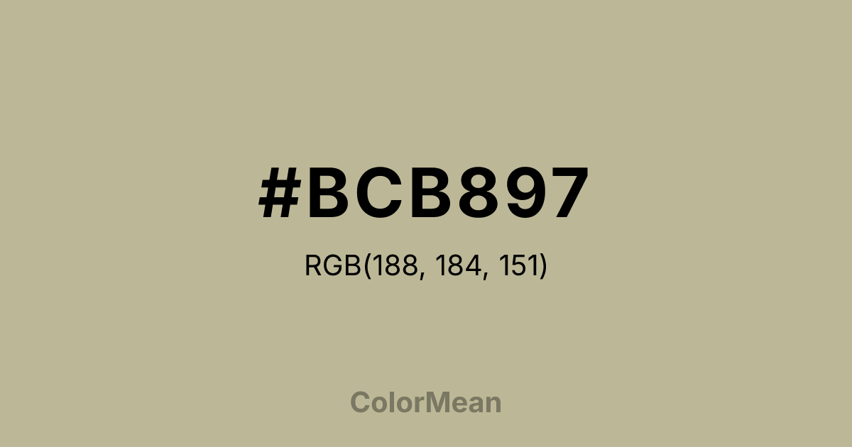 #BCB897 RGB value is (188, 184, 151). The hex color red value is 188, green is 184, and blue is 151. Its HSL format shows a hue of 54°, saturation of 22 percent, and lightness of 66 percent. The CMYK process values are 0 percent, 2 percent, 20 percent, 26 percent.