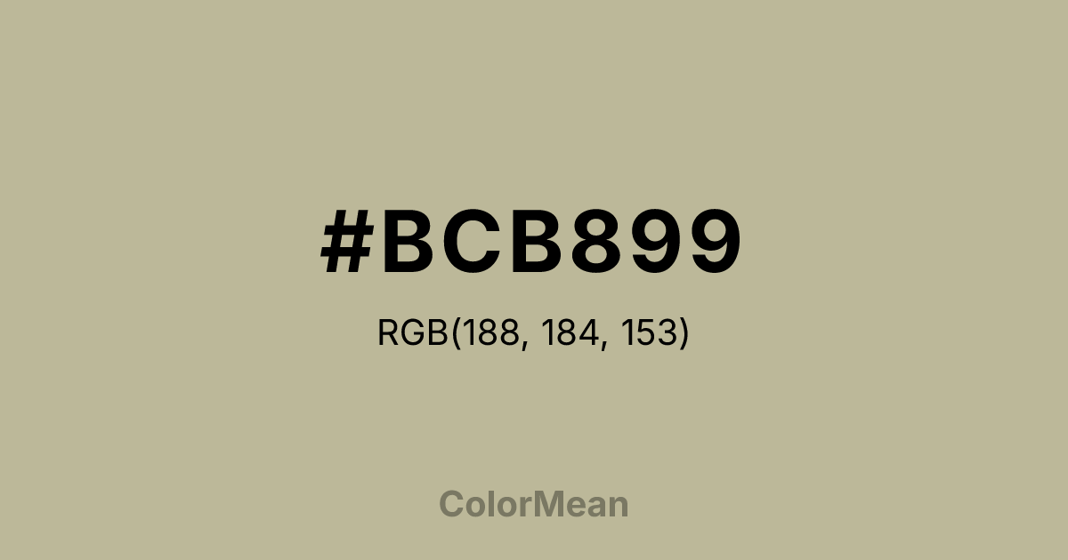 #BCB899 RGB value is (188, 184, 153). The hex color red value is 188, green is 184, and blue is 153. Its HSL format shows a hue of 53°, saturation of 21 percent, and lightness of 67 percent. The CMYK process values are 0 percent, 2 percent, 19 percent, 26 percent.