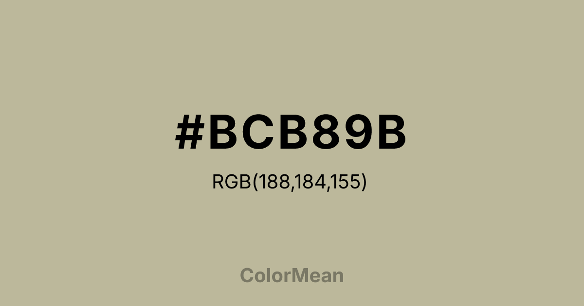 #BCB89B RGB value is (188, 184, 155). The hex color red value is 188, green is 184, and blue is 155. Its HSL format shows a hue of 53°, saturation of 20 percent, and lightness of 67 percent. The CMYK process values are 0 percent, 2 percent, 18 percent, 26 percent.