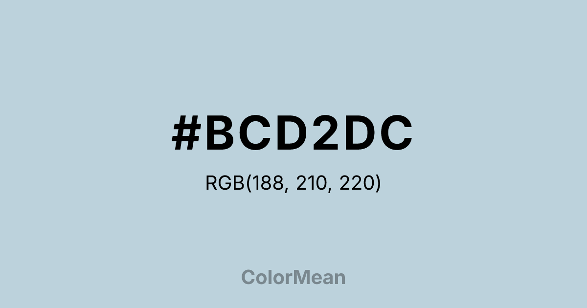 #BCD2DC RGB value is (188, 210, 220). The hex color red value is 188, green is 210, and blue is 220. Its HSL format shows a hue of 199°, saturation of 31 percent, and lightness of 80 percent. The CMYK process values are 15 percent, 5 percent, 0 percent, 14 percent.