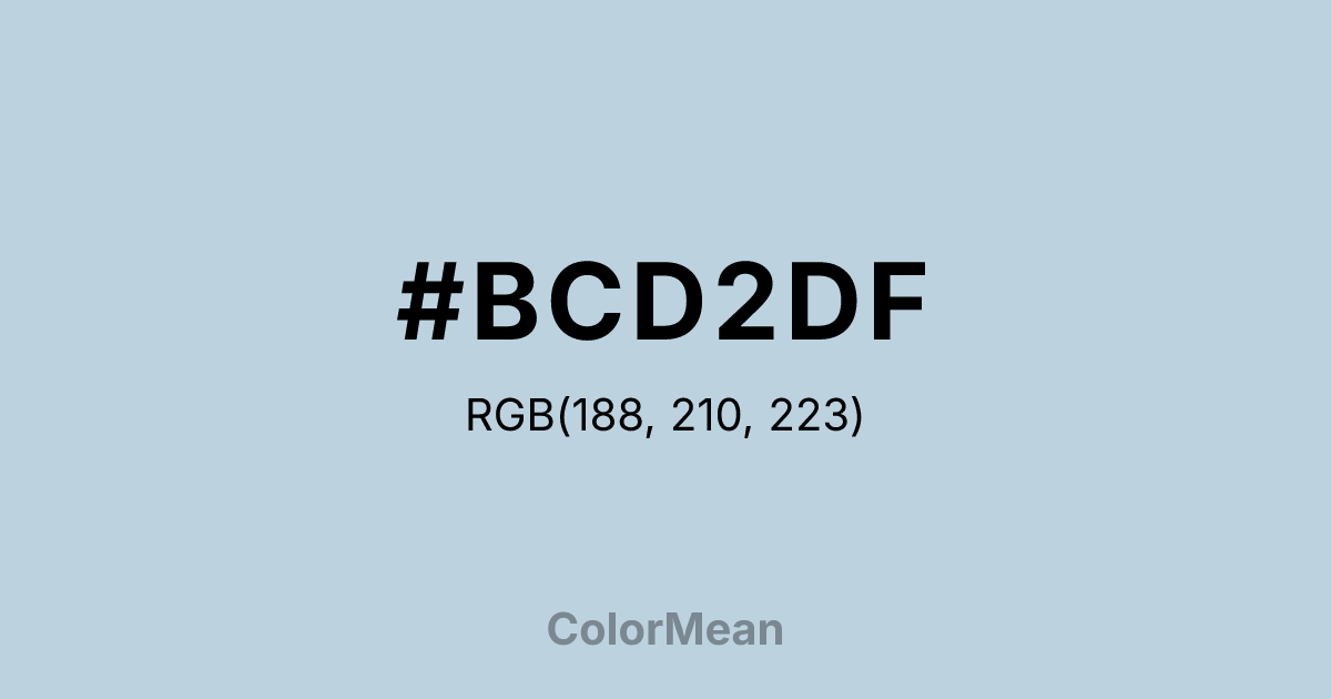 #BCD2DF RGB value is (188, 210, 223). The hex color red value is 188, green is 210, and blue is 223. Its HSL format shows a hue of 202°, saturation of 35 percent, and lightness of 81 percent. The CMYK process values are 16 percent, 6 percent, 0 percent, 13 percent.