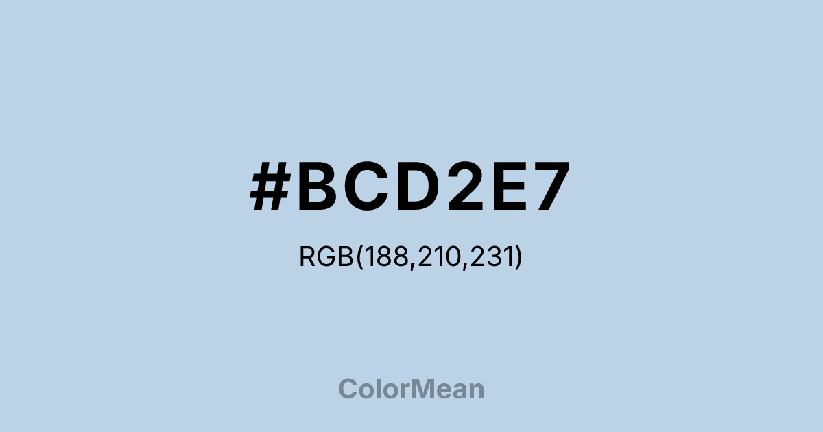 #BCD2E7 RGB value is (188, 210, 231). The hex color red value is 188, green is 210, and blue is 231. Its HSL format shows a hue of 209°, saturation of 47 percent, and lightness of 82 percent. The CMYK process values are 19 percent, 9 percent, 0 percent, 9 percent.