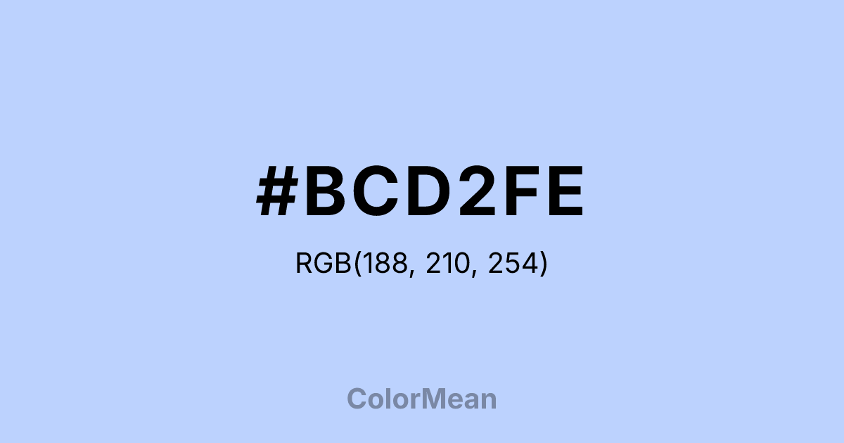 #BCD2FE RGB value is (188, 210, 254). The hex color red value is 188, green is 210, and blue is 254. Its HSL format shows a hue of 220°, saturation of 97 percent, and lightness of 87 percent. The CMYK process values are 26 percent, 17 percent, 0 percent, 0 percent.