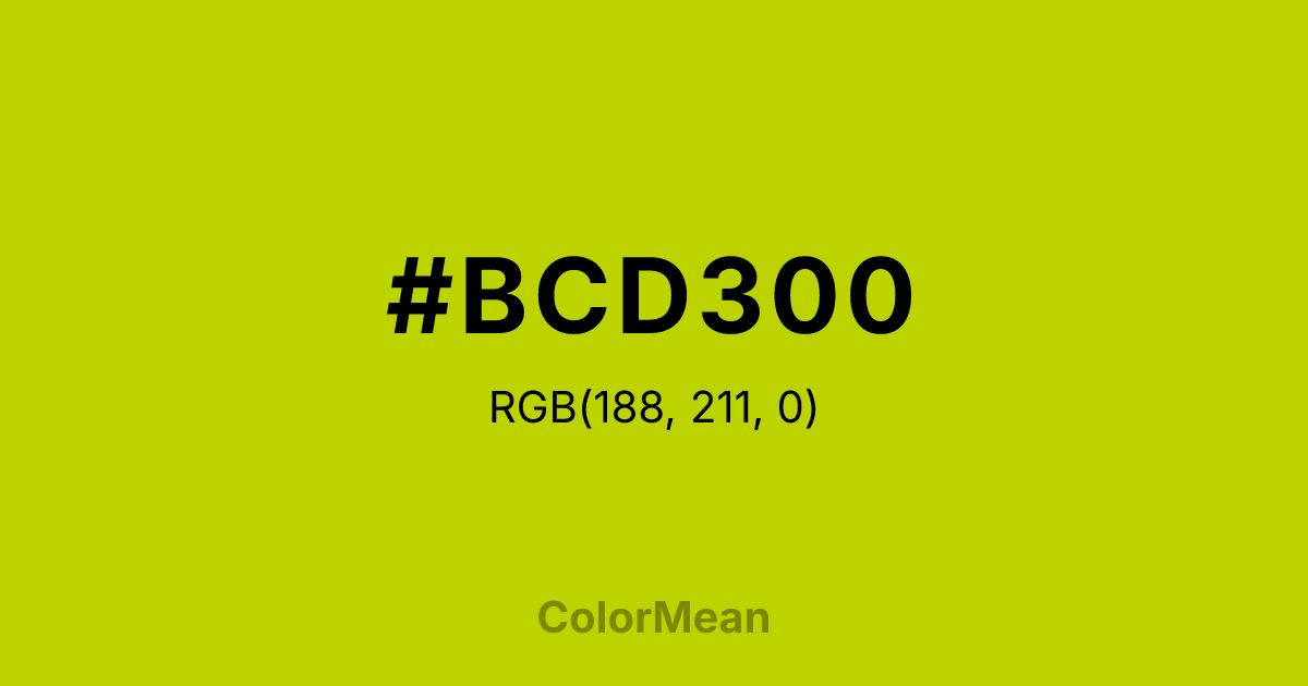 #BCD300 RGB value is (188, 211, 0). The hex color red value is 188, green is 211, and blue is 0. Its HSL format shows a hue of 67°, saturation of 100 percent, and lightness of 41 percent. The CMYK process values are 11 percent, 0 percent, 100 percent, 17 percent.