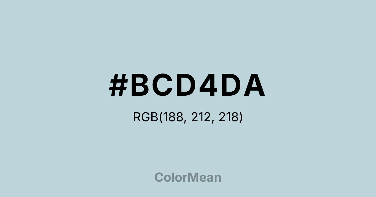 #BCD4DA RGB value is (188, 212, 218). The hex color red value is 188, green is 212, and blue is 218. Its HSL format shows a hue of 192°, saturation of 29 percent, and lightness of 80 percent. The CMYK process values are 14 percent, 3 percent, 0 percent, 15 percent.