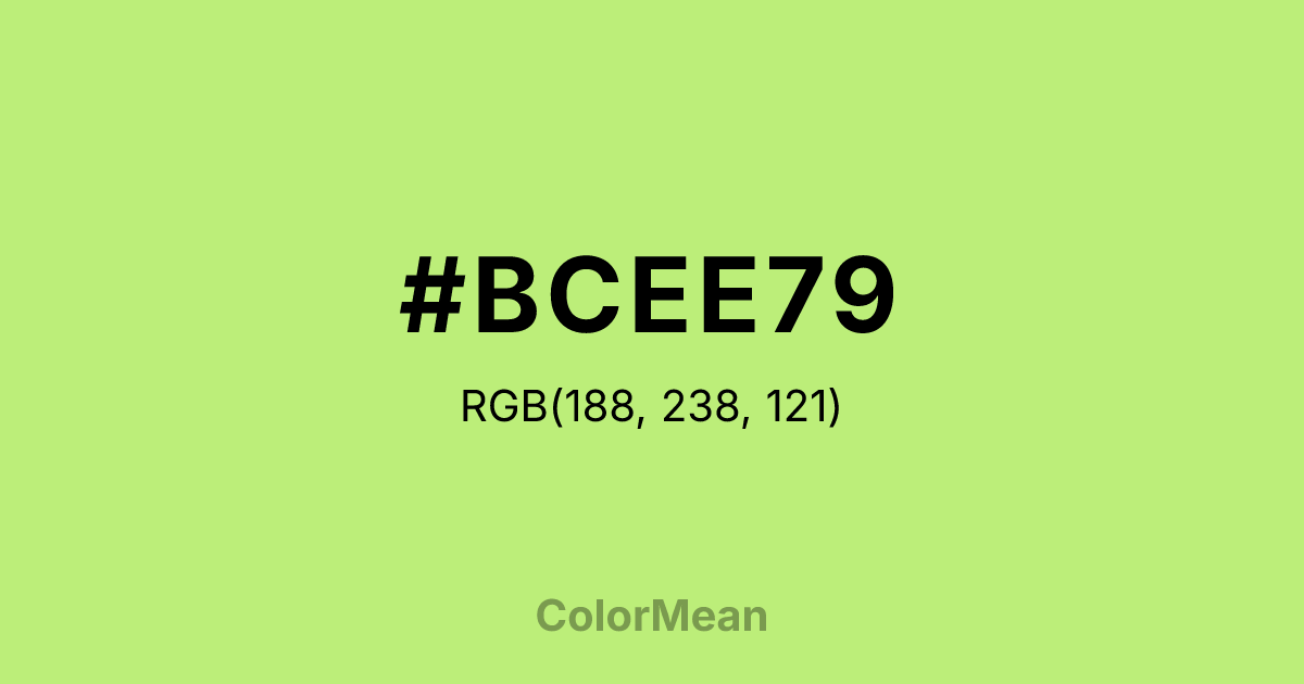 #BCEE79 RGB value is (188, 238, 121). The hex color red value is 188, green is 238, and blue is 121. Its HSL format shows a hue of 86°, saturation of 77 percent, and lightness of 70 percent. The CMYK process values are 21 percent, 0 percent, 49 percent, 7 percent.