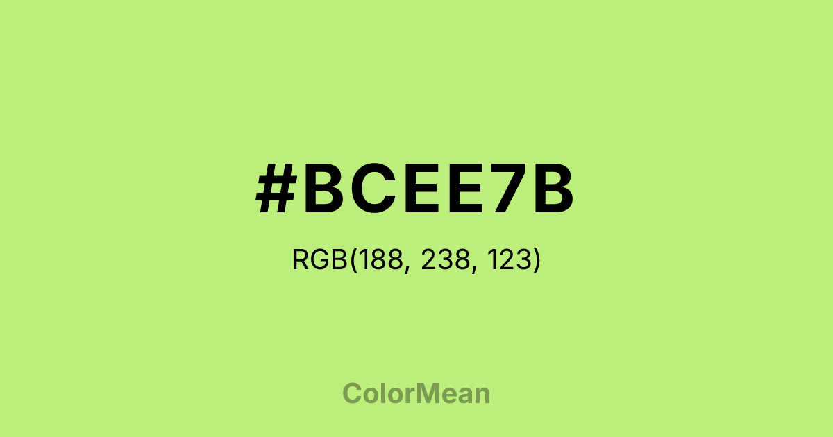 #BCEE7B RGB value is (188, 238, 123). The hex color red value is 188, green is 238, and blue is 123. Its HSL format shows a hue of 86°, saturation of 77 percent, and lightness of 71 percent. The CMYK process values are 21 percent, 0 percent, 48 percent, 7 percent.