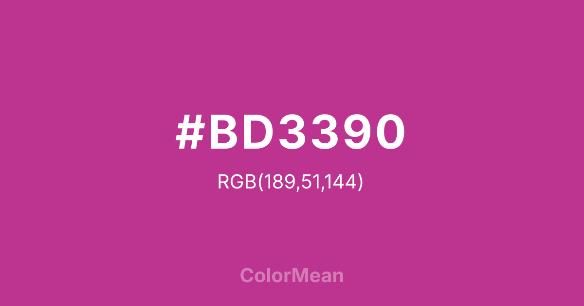 #BD3390 RGB value is (189, 51, 144). The hex color red value is 189, green is 51, and blue is 144. Its HSL format shows a hue of 320°, saturation of 58 percent, and lightness of 47 percent. The CMYK process values are 0 percent, 73 percent, 24 percent, 26 percent.