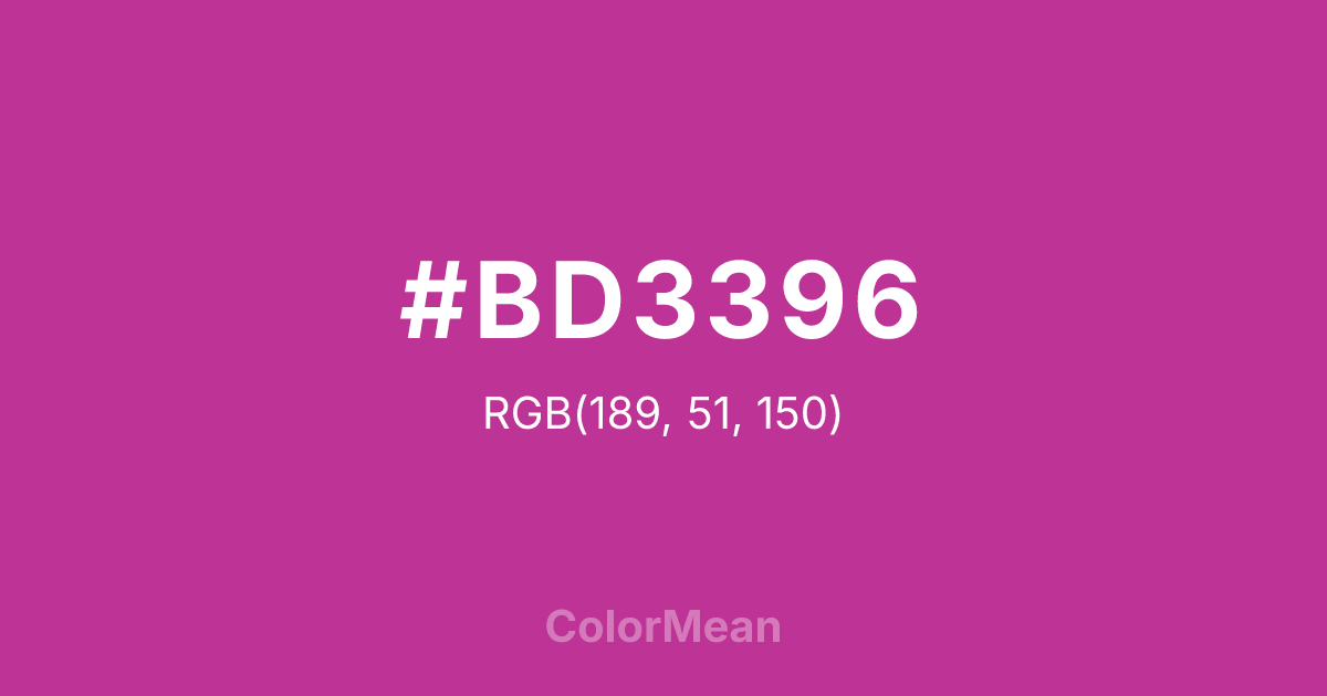 #BD3396 RGB value is (189, 51, 150). The hex color red value is 189, green is 51, and blue is 150. Its HSL format shows a hue of 317°, saturation of 58 percent, and lightness of 47 percent. The CMYK process values are 0 percent, 73 percent, 21 percent, 26 percent.