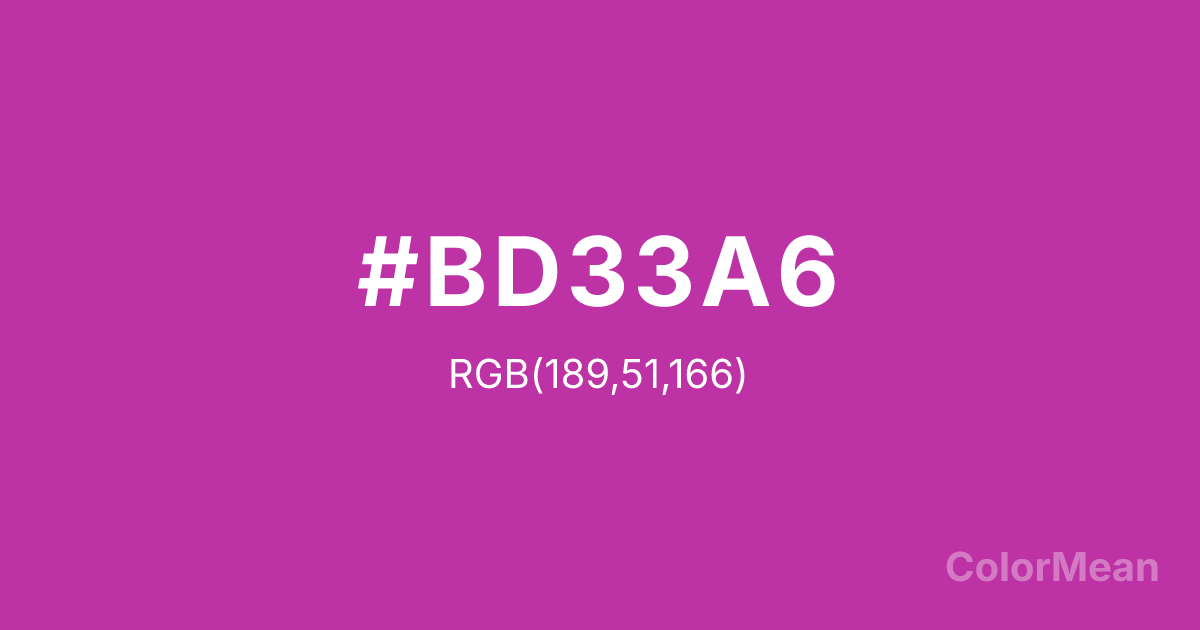 #BD33A6 RGB value is (189, 51, 166). The hex color red value is 189, green is 51, and blue is 166. Its HSL format shows a hue of 310°, saturation of 58 percent, and lightness of 47 percent. The CMYK process values are 0 percent, 73 percent, 12 percent, 26 percent.