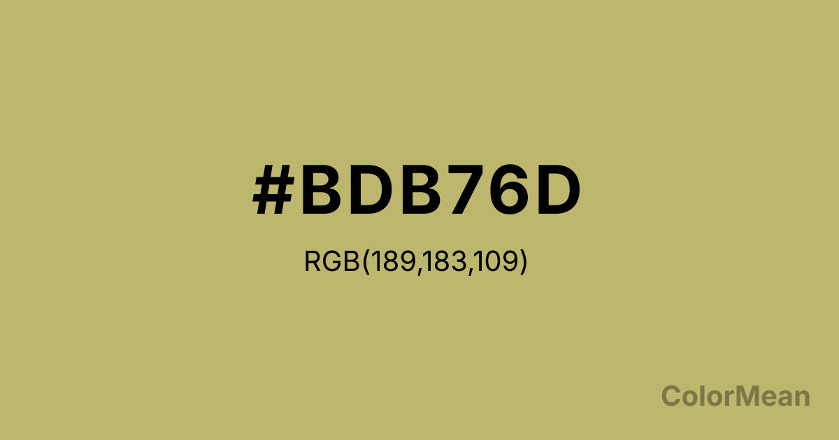 #BDB76D RGB value is (189, 183, 109). The hex color red value is 189, green is 183, and blue is 109. Its HSL format shows a hue of 55°, saturation of 38 percent, and lightness of 58 percent. The CMYK process values are 0 percent, 3 percent, 42 percent, 26 percent.