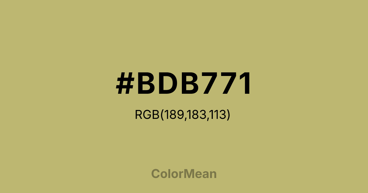 #BDB771 RGB value is (189, 183, 113). The hex color red value is 189, green is 183, and blue is 113. Its HSL format shows a hue of 55°, saturation of 37 percent, and lightness of 59 percent. The CMYK process values are 0 percent, 3 percent, 40 percent, 26 percent.