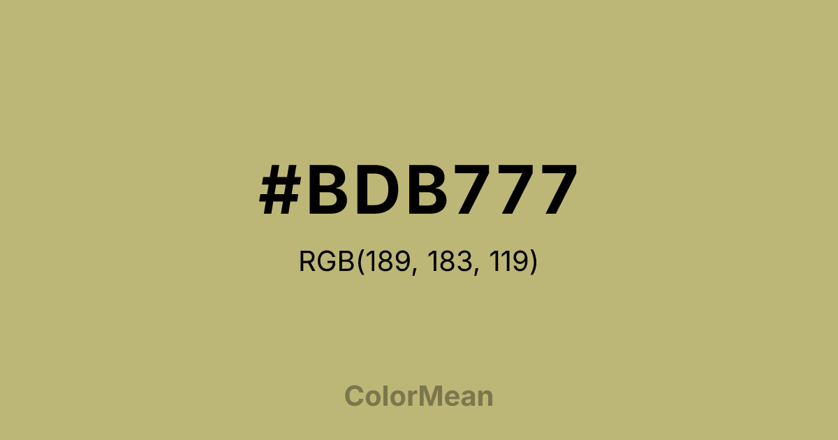 #BDB777 RGB value is (189, 183, 119). The hex color red value is 189, green is 183, and blue is 119. Its HSL format shows a hue of 55°, saturation of 35 percent, and lightness of 60 percent. The CMYK process values are 0 percent, 3 percent, 37 percent, 26 percent.