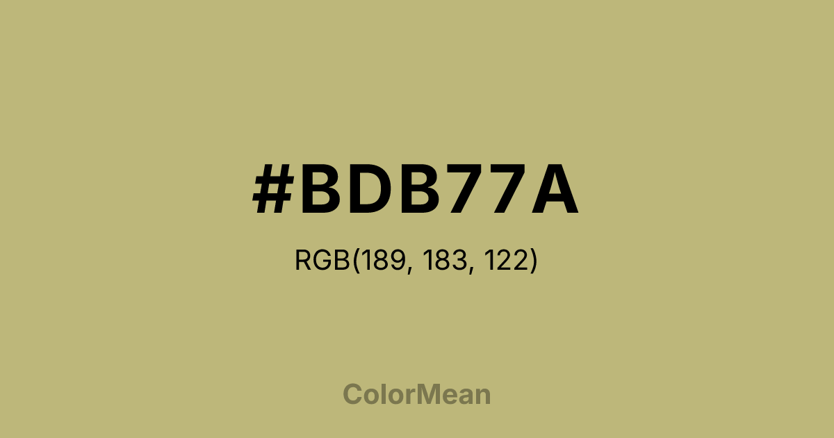 #BDB77A RGB value is (189, 183, 122). The hex color red value is 189, green is 183, and blue is 122. Its HSL format shows a hue of 55°, saturation of 34 percent, and lightness of 61 percent. The CMYK process values are 0 percent, 3 percent, 35 percent, 26 percent.