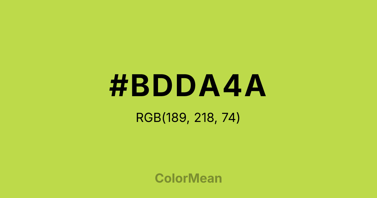 #BDDA4A RGB value is (189, 218, 74). The hex color red value is 189, green is 218, and blue is 74. Its HSL format shows a hue of 72°, saturation of 66 percent, and lightness of 57 percent. The CMYK process values are 13 percent, 0 percent, 66 percent, 15 percent.