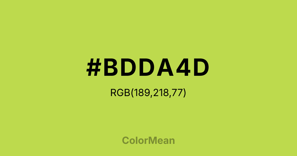 #BDDA4D RGB value is (189, 218, 77). The hex color red value is 189, green is 218, and blue is 77. Its HSL format shows a hue of 72°, saturation of 66 percent, and lightness of 58 percent. The CMYK process values are 13 percent, 0 percent, 65 percent, 15 percent.