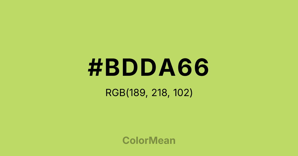 #BDDA66 RGB value is (189, 218, 102). The hex color red value is 189, green is 218, and blue is 102. Its HSL format shows a hue of 75°, saturation of 61 percent, and lightness of 63 percent. The CMYK process values are 13 percent, 0 percent, 53 percent, 15 percent.