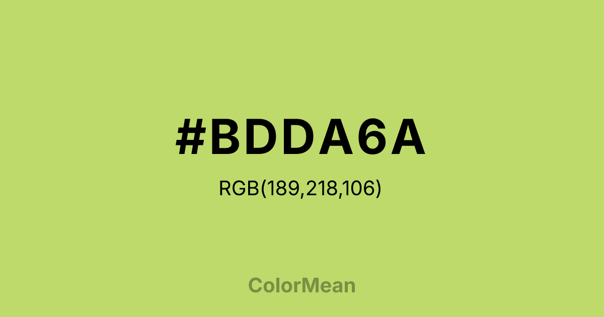 #BDDA6A RGB value is (189, 218, 106). The hex color red value is 189, green is 218, and blue is 106. Its HSL format shows a hue of 76°, saturation of 60 percent, and lightness of 64 percent. The CMYK process values are 13 percent, 0 percent, 51 percent, 15 percent.