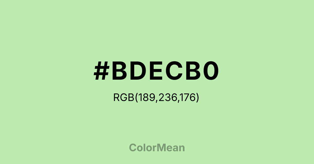 #BDECB0 RGB value is (189, 236, 176). The hex color red value is 189, green is 236, and blue is 176. Its HSL format shows a hue of 107°, saturation of 61 percent, and lightness of 81 percent. The CMYK process values are 20 percent, 0 percent, 25 percent, 7 percent.