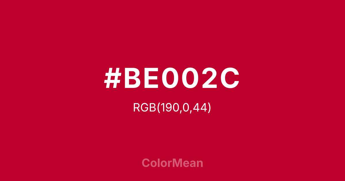 #BE002C RGB value is (190, 0, 44). The hex color red value is 190, green is 0, and blue is 44. Its HSL format shows a hue of 346°, saturation of 100 percent, and lightness of 37 percent. The CMYK process values are 0 percent, 100 percent, 77 percent, 25 percent.