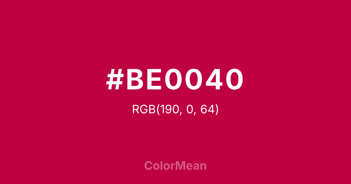 #BE0040 RGB value is (190, 0, 64). The hex color red value is 190, green is 0, and blue is 64. Its HSL format shows a hue of 340°, saturation of 100 percent, and lightness of 37 percent. The CMYK process values are 0 percent, 100 percent, 66 percent, 25 percent.