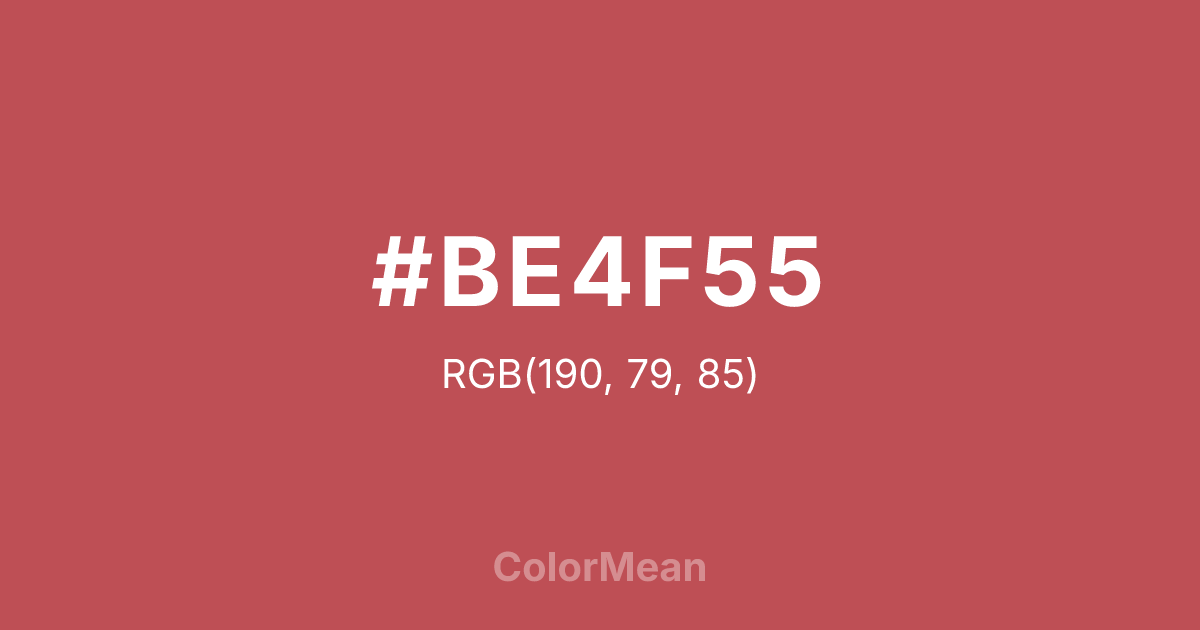 #BE4F55 RGB value is (190, 79, 85). The hex color red value is 190, green is 79, and blue is 85. Its HSL format shows a hue of 357°, saturation of 46 percent, and lightness of 53 percent. The CMYK process values are 0 percent, 58 percent, 55 percent, 25 percent.