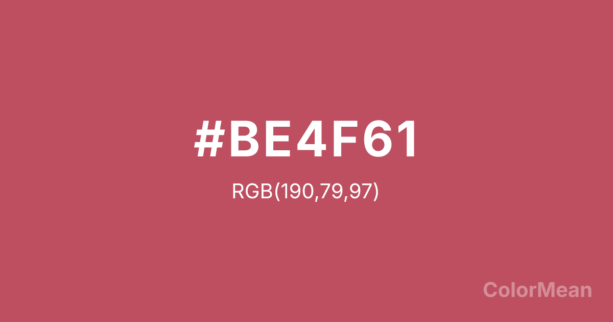 #BE4F61 RGB value is (190, 79, 97). The hex color red value is 190, green is 79, and blue is 97. Its HSL format shows a hue of 350°, saturation of 46 percent, and lightness of 53 percent. The CMYK process values are 0 percent, 58 percent, 49 percent, 25 percent.