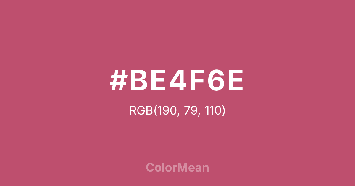 #BE4F6E RGB value is (190, 79, 110). The hex color red value is 190, green is 79, and blue is 110. Its HSL format shows a hue of 343°, saturation of 46 percent, and lightness of 53 percent. The CMYK process values are 0 percent, 58 percent, 42 percent, 25 percent.