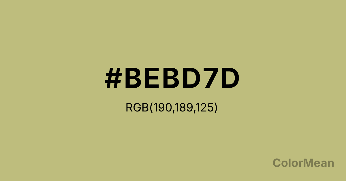 #BEBD7D RGB value is (190, 189, 125). The hex color red value is 190, green is 189, and blue is 125. Its HSL format shows a hue of 59°, saturation of 33 percent, and lightness of 62 percent. The CMYK process values are 0 percent, 1 percent, 34 percent, 25 percent.