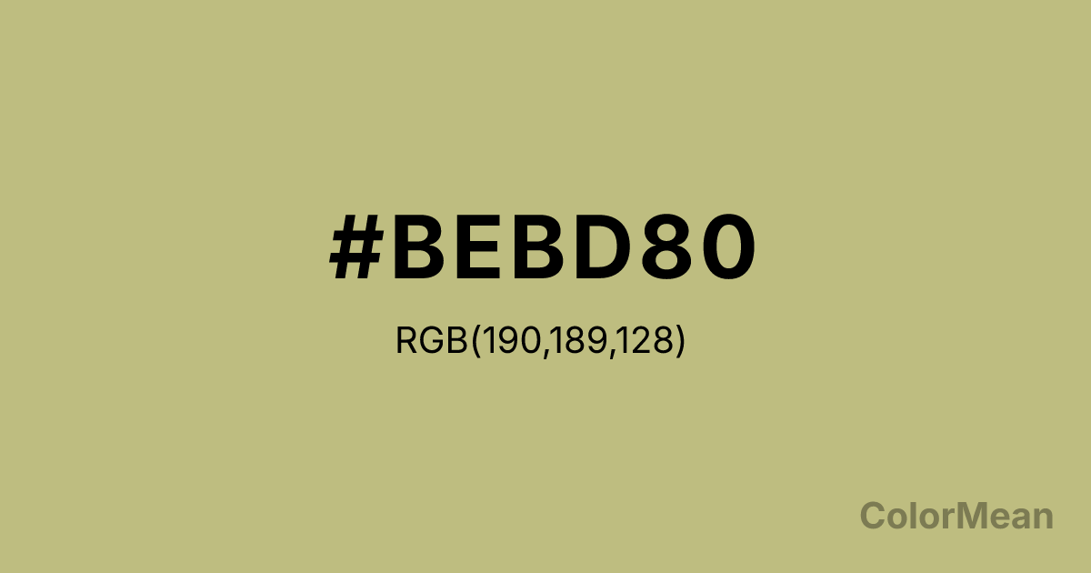 #BEBD80 RGB value is (190, 189, 128). The hex color red value is 190, green is 189, and blue is 128. Its HSL format shows a hue of 59°, saturation of 32 percent, and lightness of 62 percent. The CMYK process values are 0 percent, 1 percent, 33 percent, 25 percent.